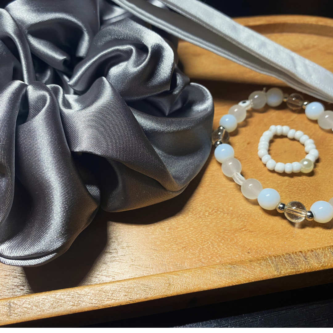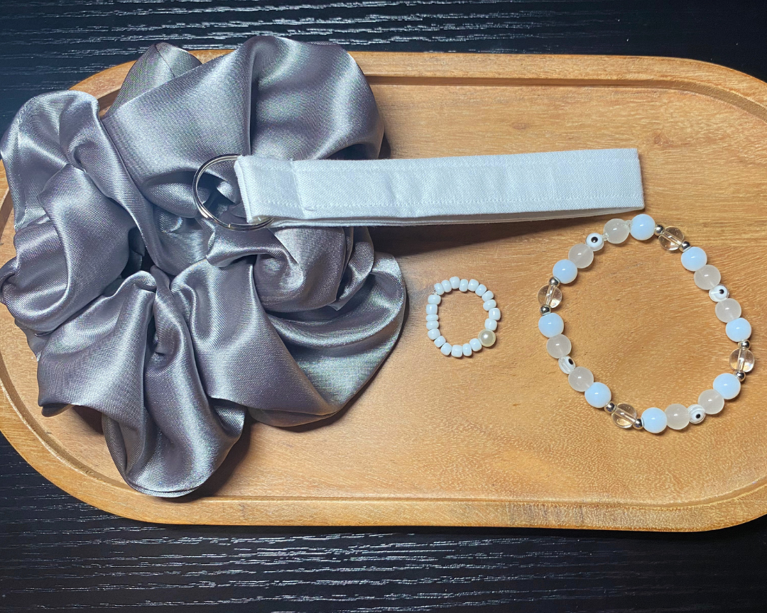 Add a touch of magic to your day with the Frosted Moon Set! This playful collection includes a scrunchie, keychain, bracelet, and ring, each designed to brighten your style. Perfect for mixing and matching, these accessories bring a fun vibe to any outfit. Embrace your inner shine wherever you go!